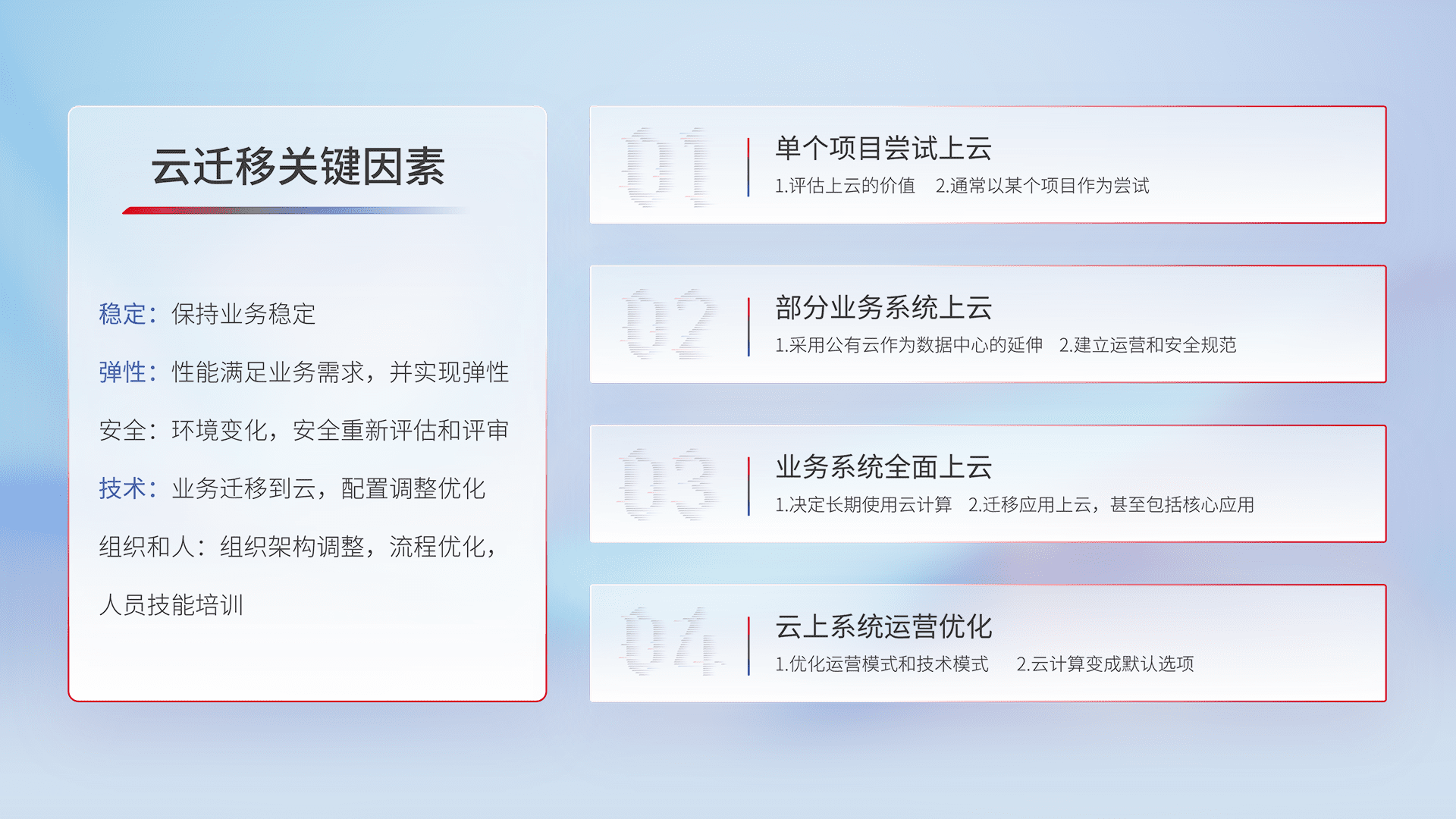 结合实际业务,,从规划设计、、云平台选型、、、云原生改造、、、、数据迁移、、、集成交付,,迁移全过程为客户识别最佳上云路径,,做好风险识别管理,,,,设计网络架构、、、、身份权限、、安全审计合规、、操作审计、、日志审计、、监控告警策略、、、、多站点容灾设计等,,,,对云上基础设施进行整体规划,,,,提升IT治理水平,,,以满足弹性、、、高可用、、、、高性能的需求。。