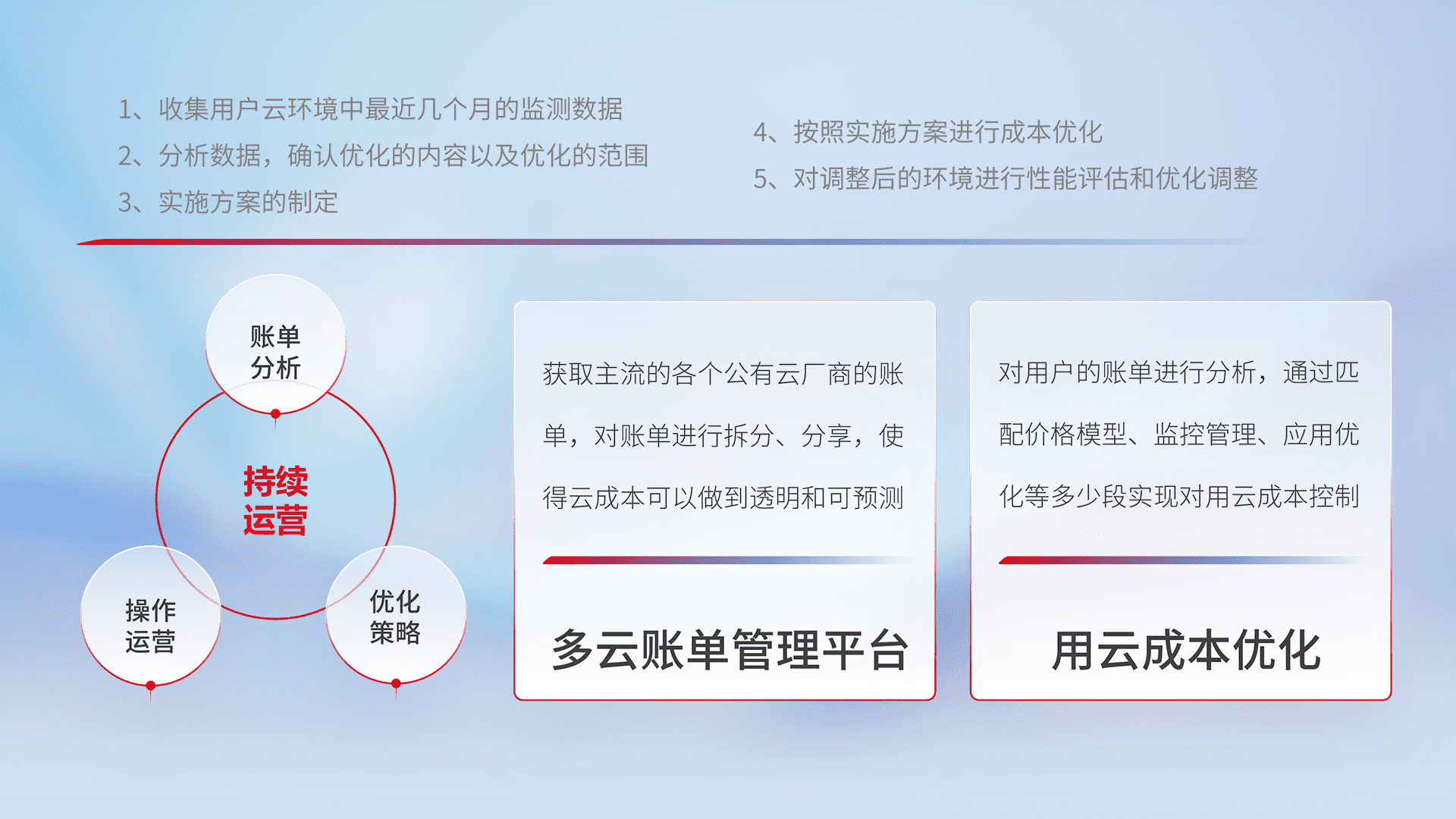 通过多云纳管,,,以统一的资源数据模型把客户的云资源进行抽象和封装,,,,进而实现对多云资源的统一操作,,,,保障云资源管理的可靠性、、、、稳定性与可用性。。量身定制化运维内容,,,配置、、开发运维、、、补丁管理、、、备份、、监控、、、、认证和访问管理、、审计和日常巡检等,,,,保障在用云过程中的可靠度,,,,稳定度以及高可用率。。
